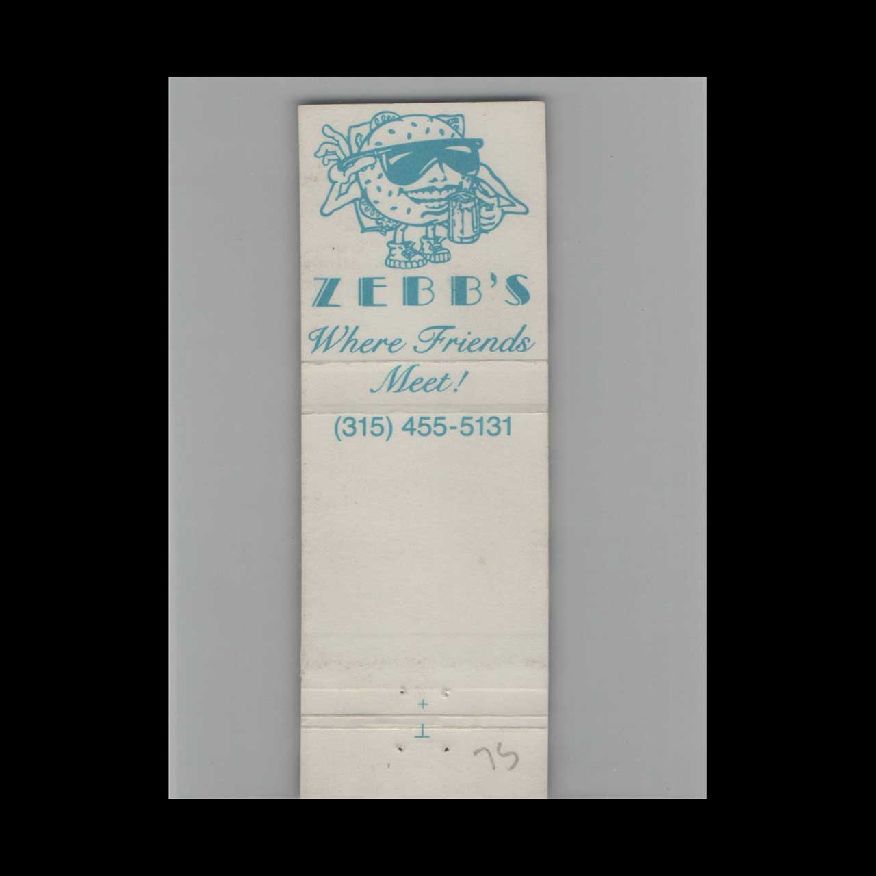 Vintage matchbook cover advertising Full Length Zebb’s Deluxe Grill & Bar Syracuse NY.
