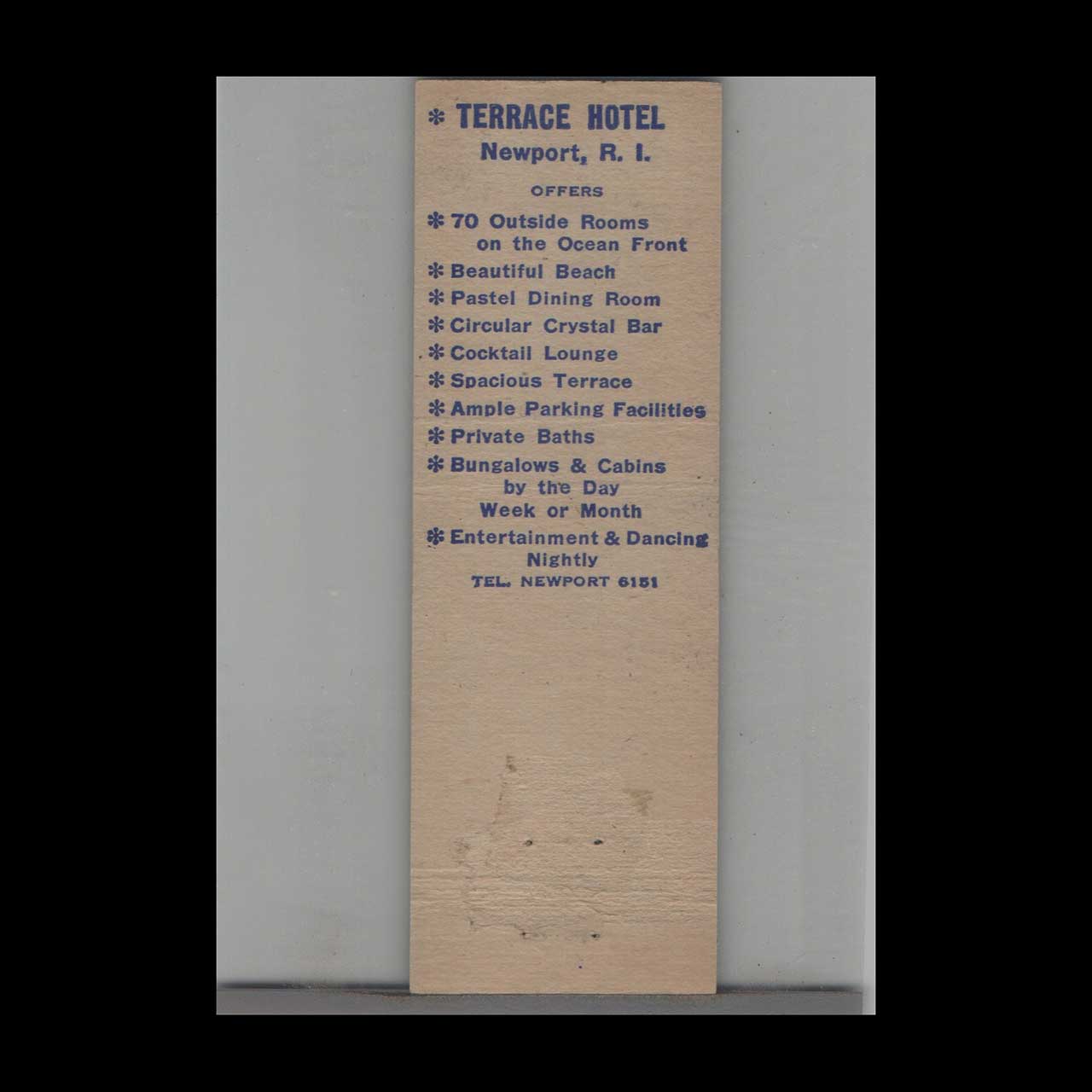 Discover the Full Length Terrace Hotel in Newport, RI, a historic seaside retreat known for its elegant charm. This vintage matchbook is a classic ephemera relic cherished by Americana collectors.
