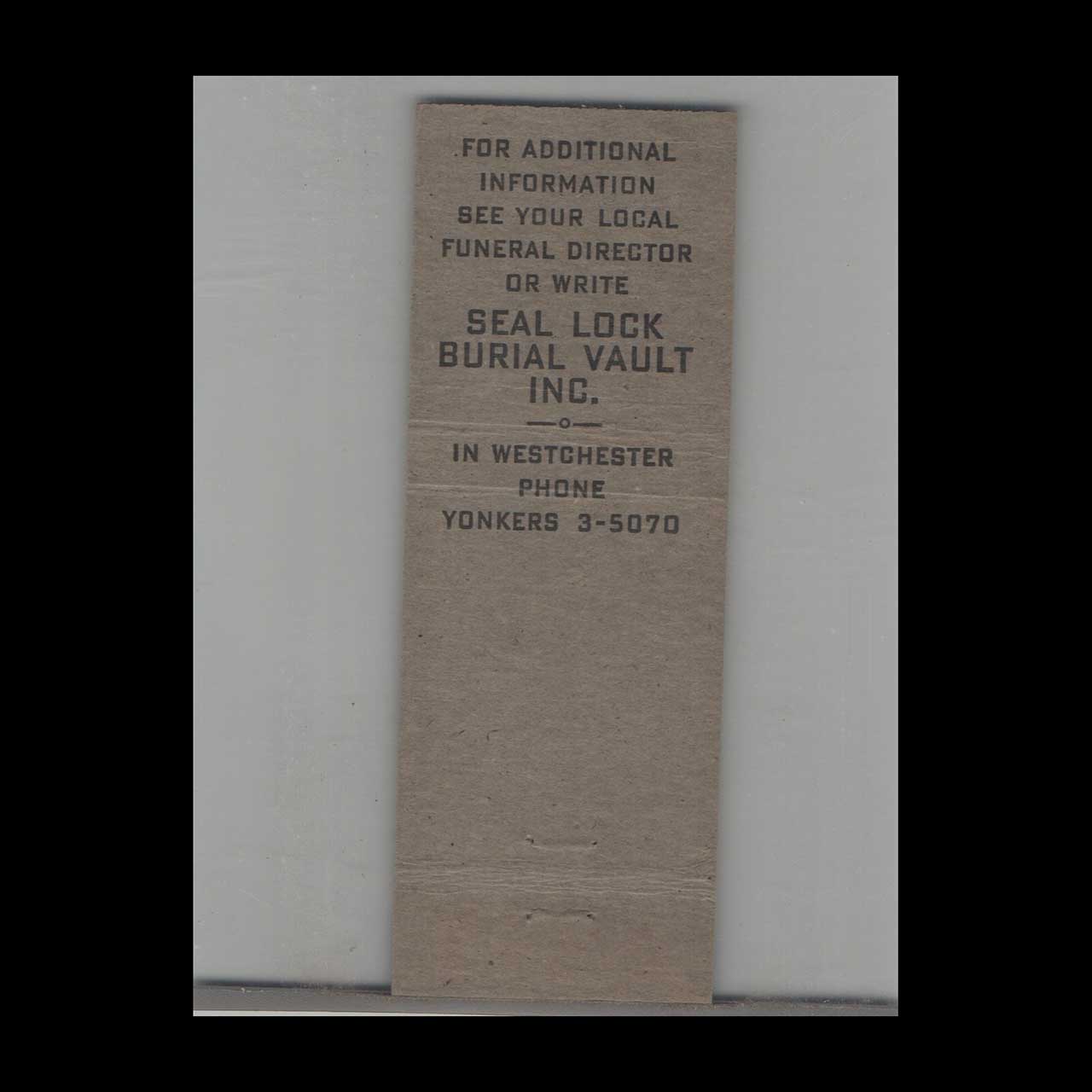 <h3>About this Vintage Matchbook</h3> <p>Forest Hills Seal Lock Burial Vault in Long Island offers secure, dignified funeral vault services. A nostalgic piece of Americana for collectors of classic ephemera.</p> <p><strong>Brand:</strong> Matchbook Cover Funeral Related Seal Lock Burial Vault Forest Hills Long Island</p> <p><strong>Category:</strong> Vintage Americana Memorabilia</p>