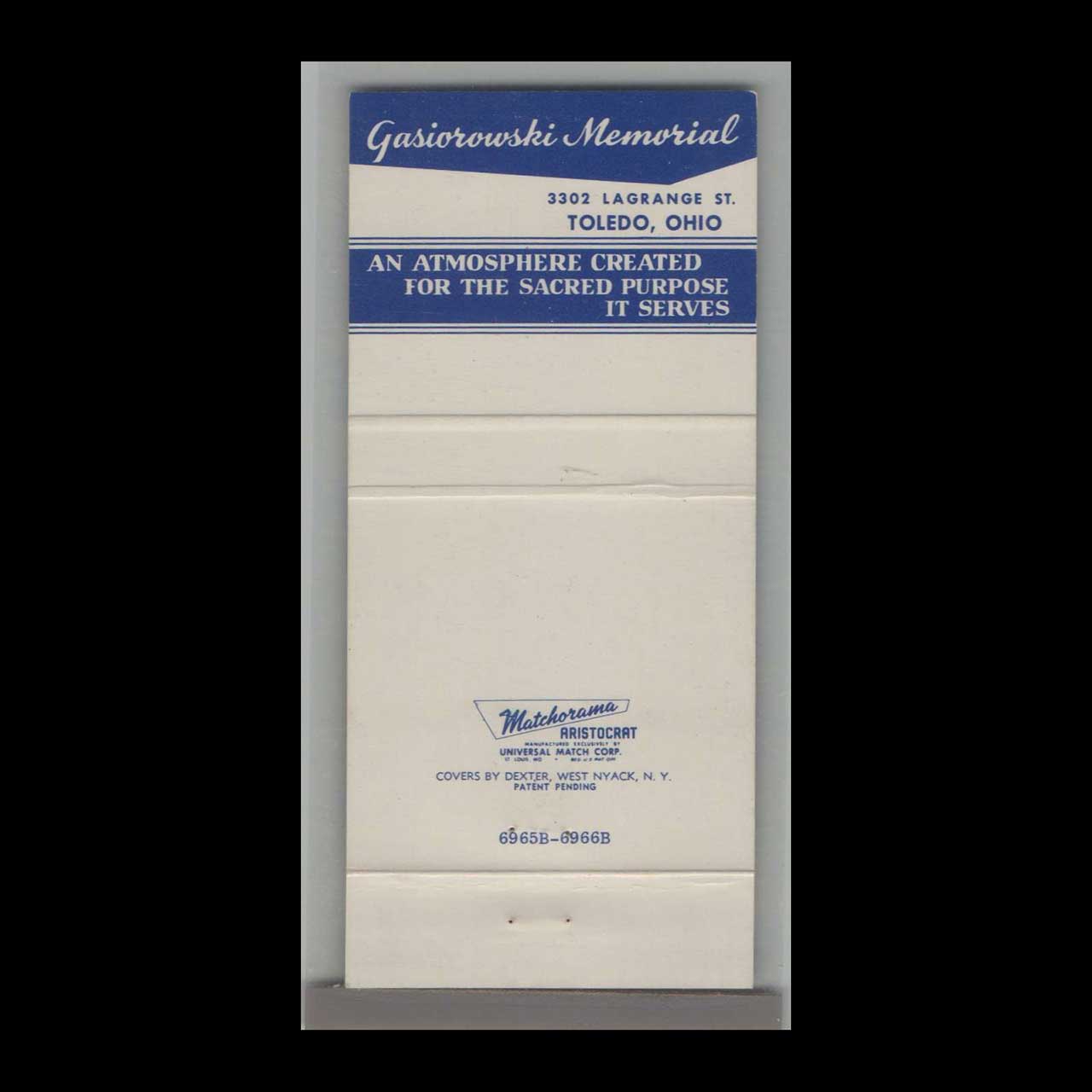 Gasiorowski Memorial Toledo Matchbook Cover