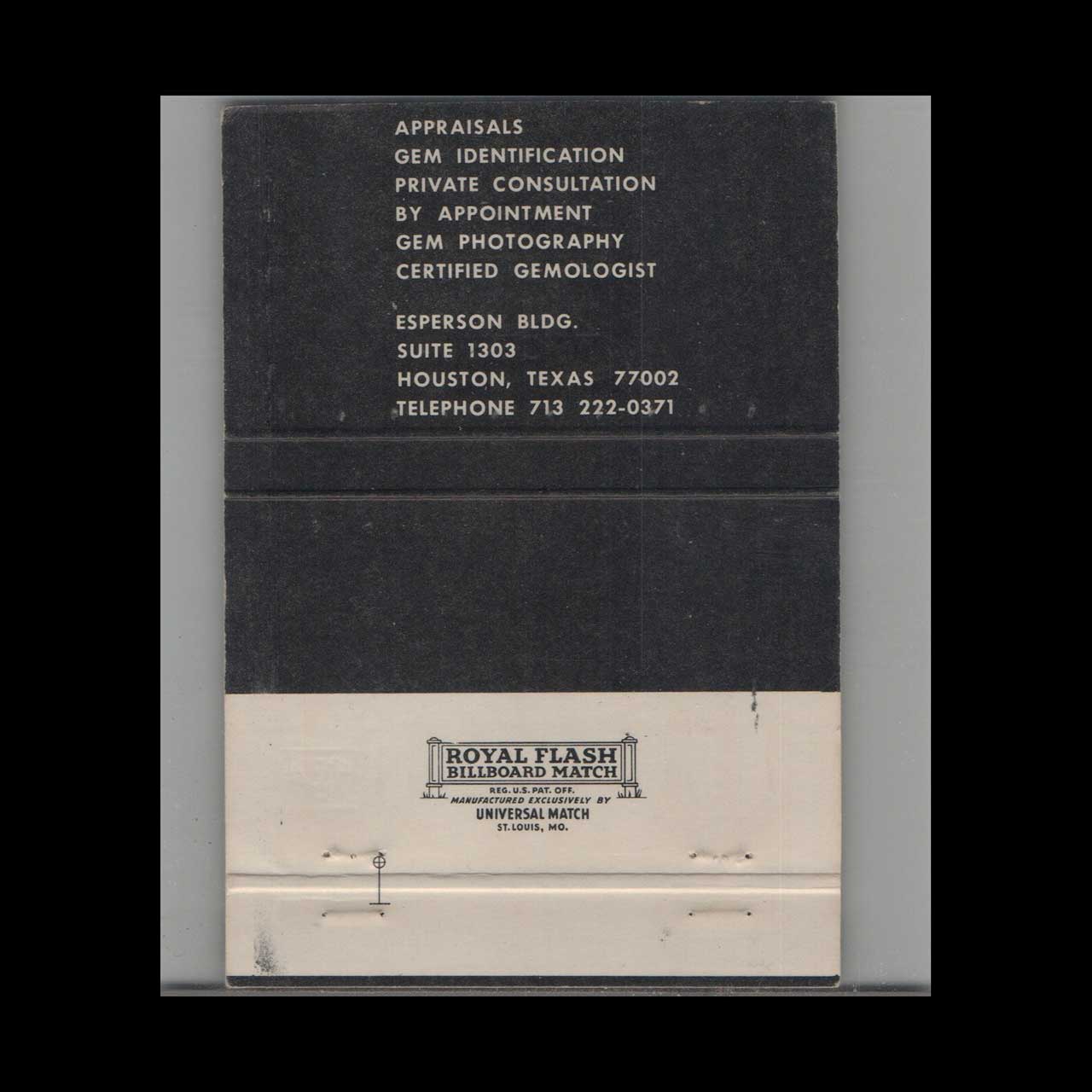 Gemological Laboratory in Houston, TX, specialized in expert gemstone analysis and appraisal. A classic ephemera relic cherished by vintage matchbook collectors.
