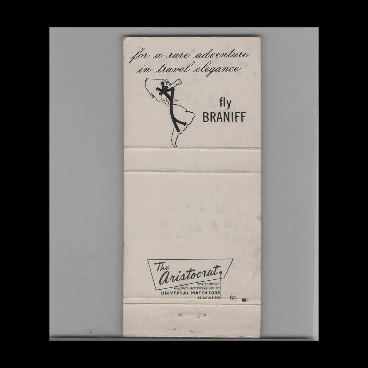 Fly Braniff Airlines offered elegant air travel with Gold Service, epitomizing mid-century aviation luxury. A nostalgic piece of Americana for collectors and vintage ephemera enthusiasts.