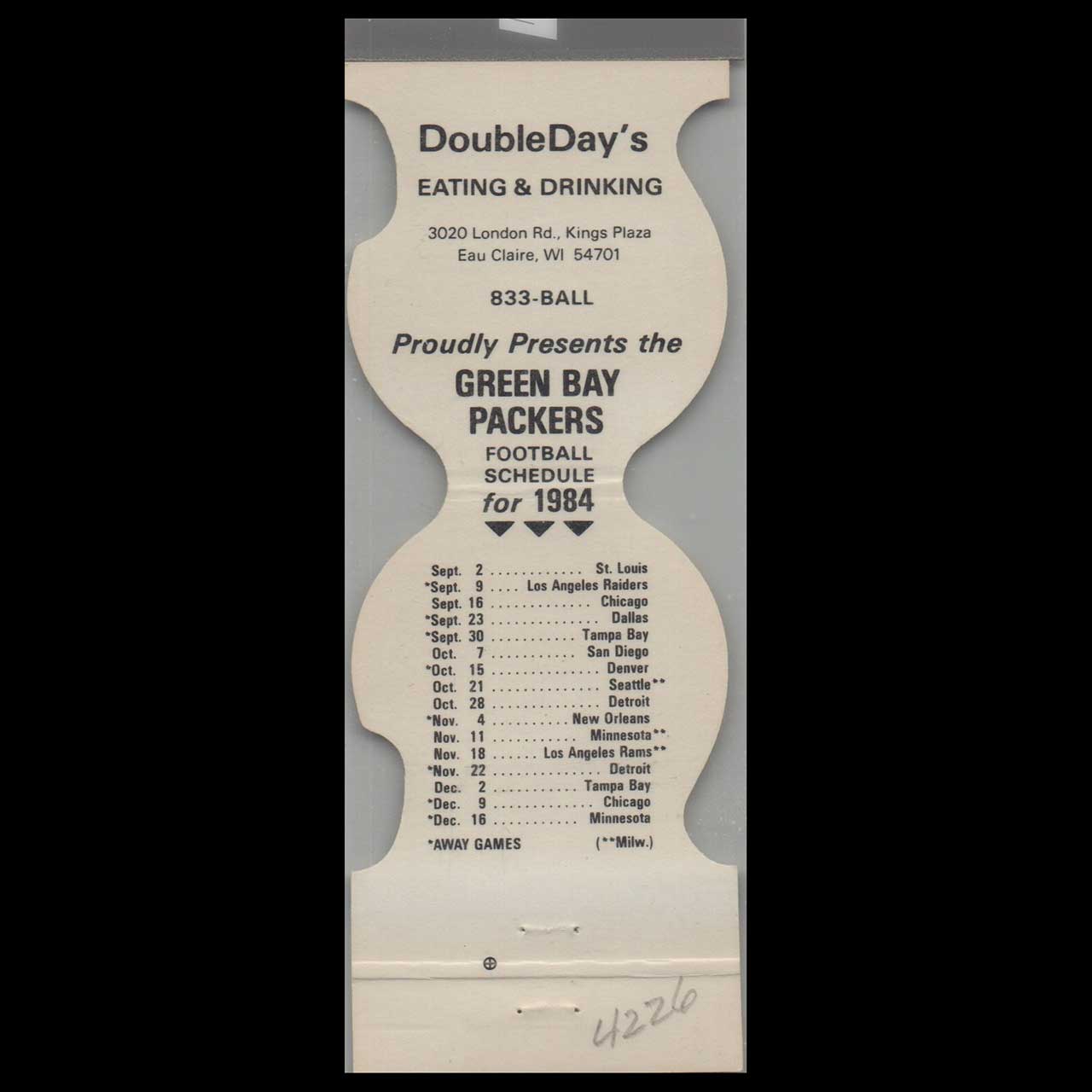 Green Bay Packers 1984 Schedule Matchbook Cover