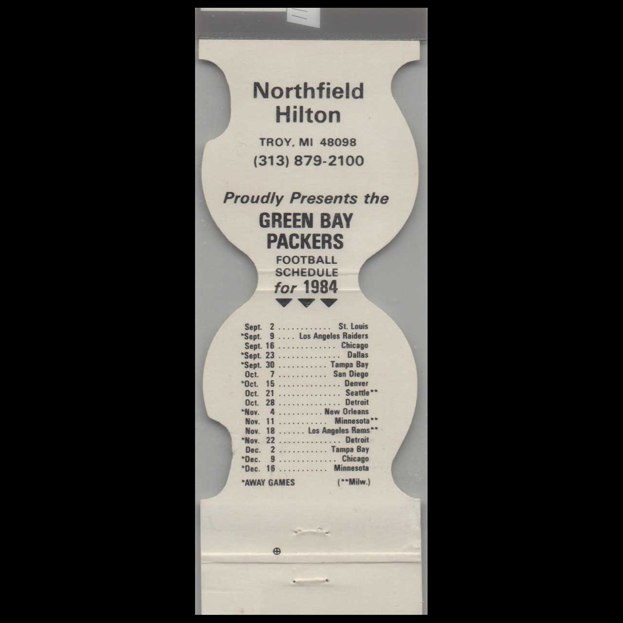 Green Bay Packers 1984 Schedule Matchbook Cover Northfield Hilton