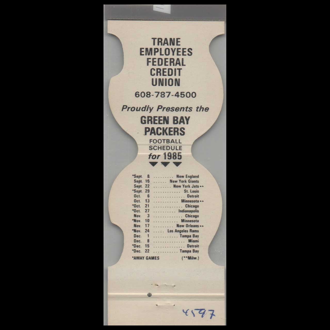 Trane Credit Union, a trusted financial institution, featured the 1985 Green Bay Packers football schedule on this vintage matchbook. A nostalgic piece of Americana for collectors and sports memorabilia enthusiasts.