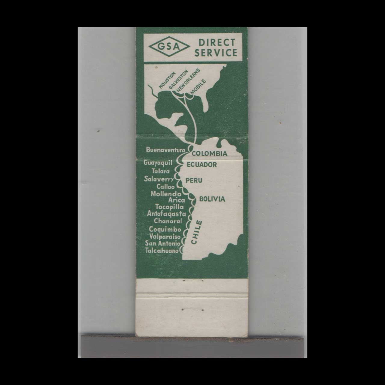 Gulf & South American Steamship Co. of New Orleans, LA, offered historic maritime travel and trade across the Americas. A classic ephemera relic cherished by vintage matchbook collectors.