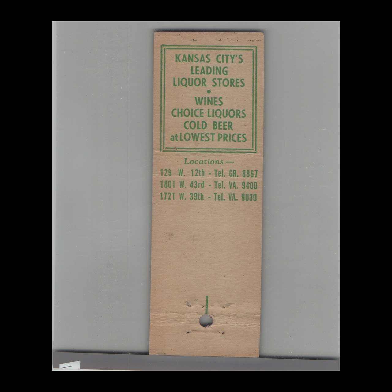 Happy Hollow Liquor Stores in Kansas City, MO, offered a distinctive local shopping experience. This stripped feature matchbook is a classic ephemera relic cherished by Americana collectors.