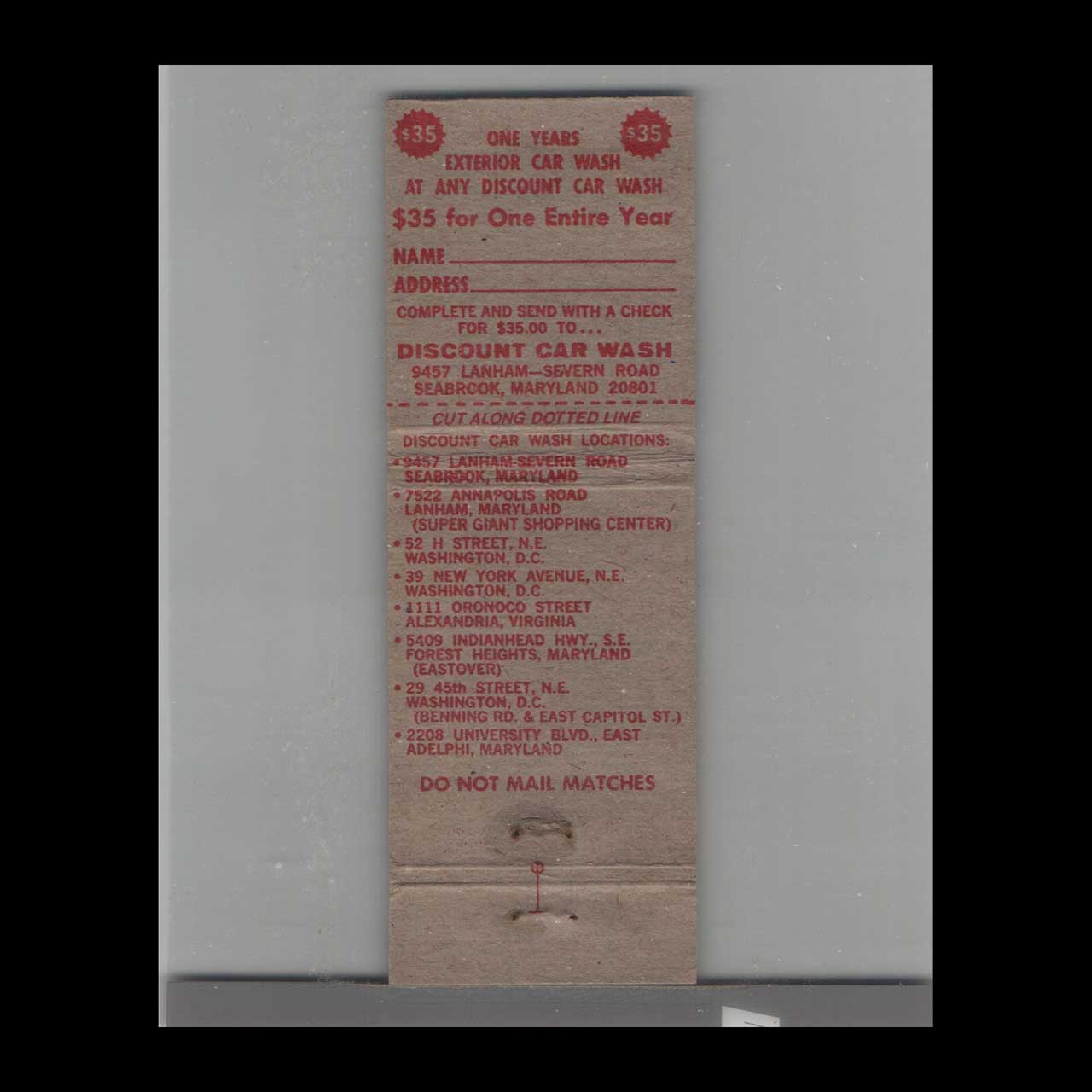 Harvey’s Discount Car Wash Matchbook Cover Washington DC