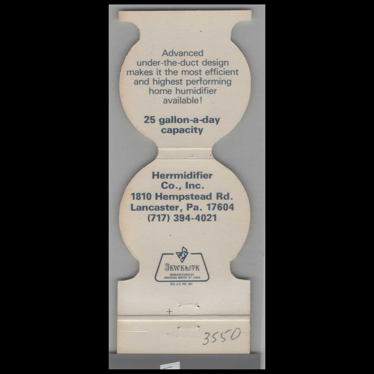 Herrmidifier Supply Co. of Providence, RI, specialized in industrial and home humidification products. This die-cut matchbook is a classic ephemera relic cherished by Americana collectors.