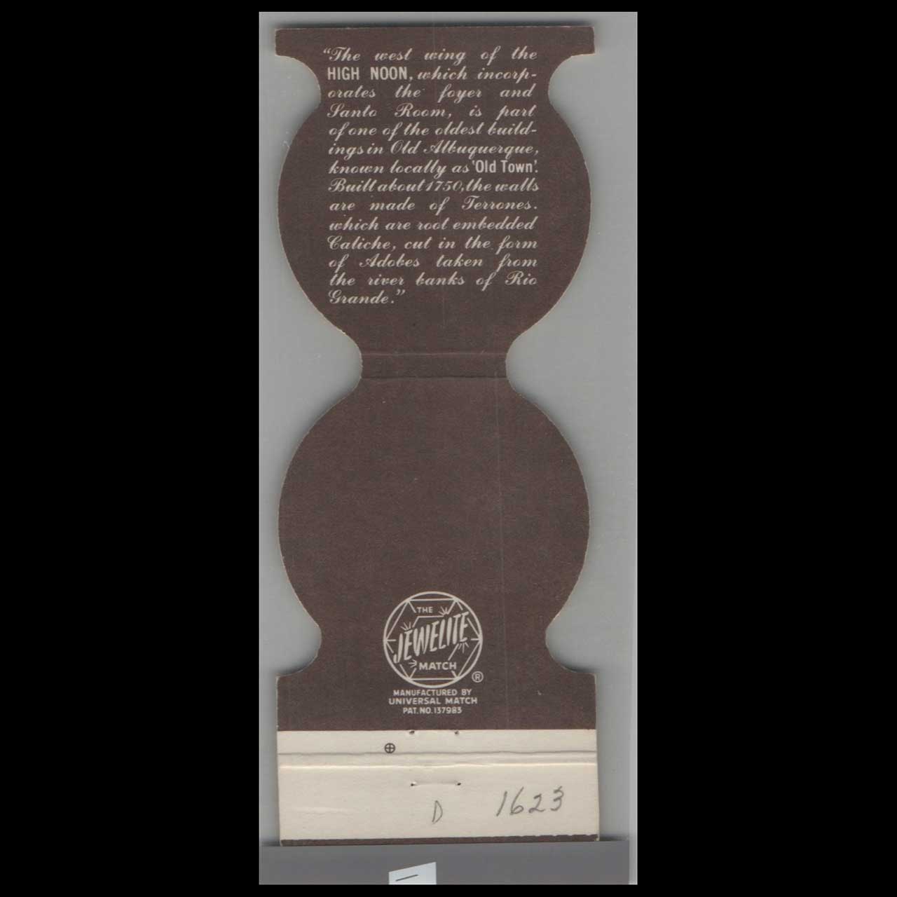 High Noon Restaurant in Old Town Albuquerque, NM, offered authentic Southwestern dining in a historic setting. This die-cut matchbook is a nostalgic piece of Americana for collectors.