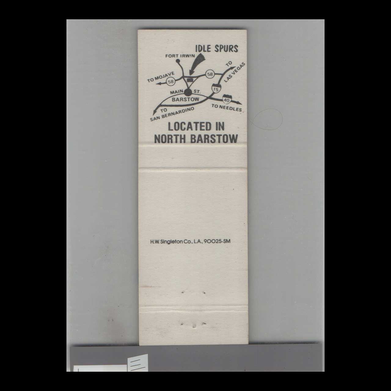 Idle Spurs Steak House in Barstow, CA, offered hearty Western dining and a lively bar atmosphere. This vintage matchbook is a nostalgic piece of Americana for collectors.