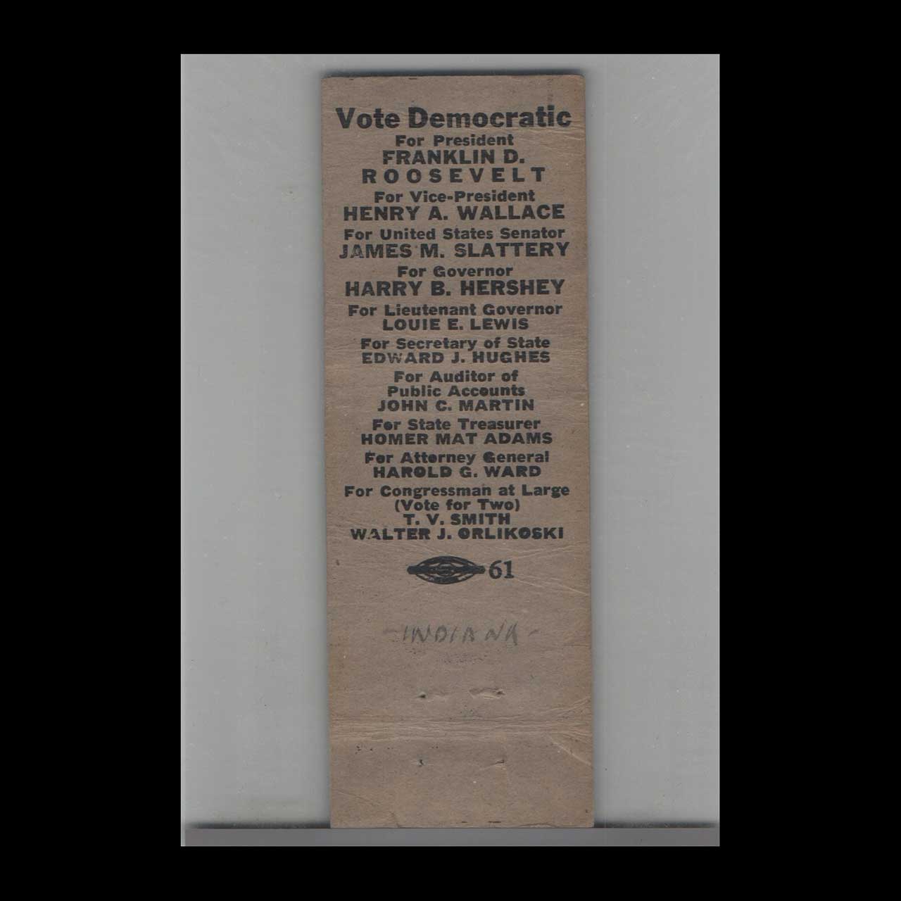 Vintage matchbook promoting James M. Slattery’s U.S. Senate campaign with Roosevelt endorsement. A nostalgic piece of Americana for collectors.