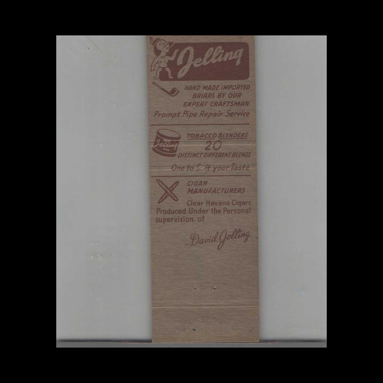 Jelling Cigar Manufacturers of Newark, NJ, crafted fine cigars with a legacy rooted in early 20th-century American industry. This vintage matchbook cover is a classic ephemera relic cherished by collectors of nostalgic Americana.