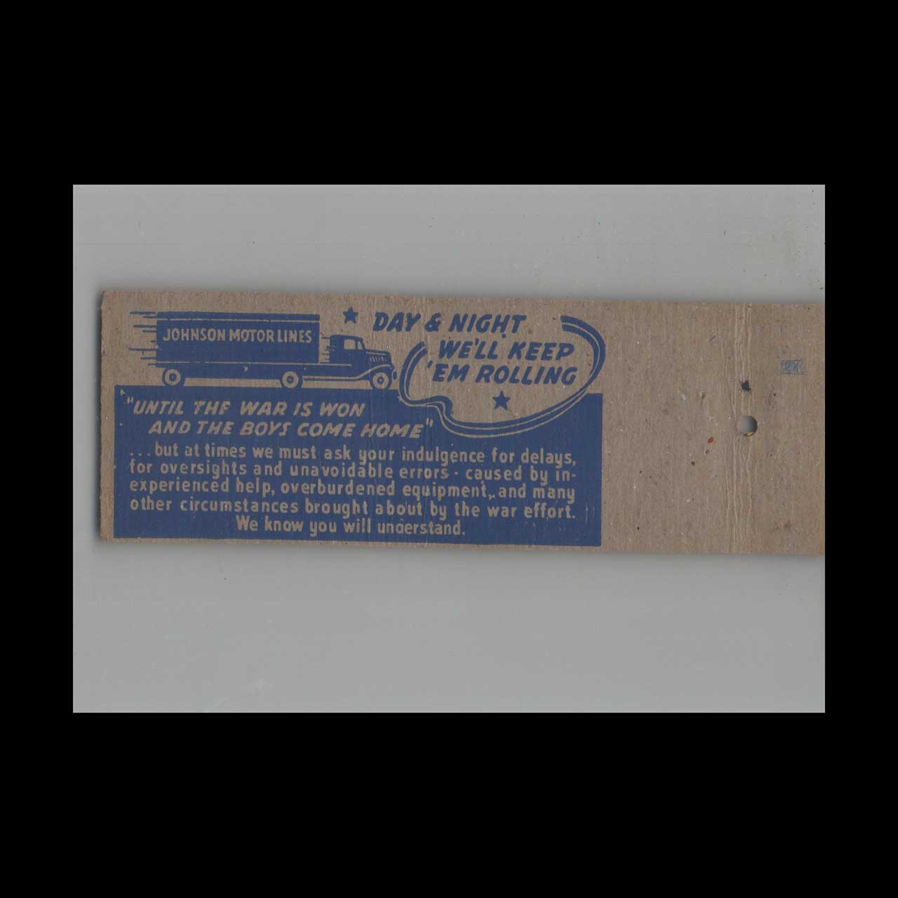 Johnson Motor Lines of Fort Worth, TX, was a key player in mid-century American trucking and logistics. This vintage matchbook is a classic ephemera relic cherished by Americana collectors.