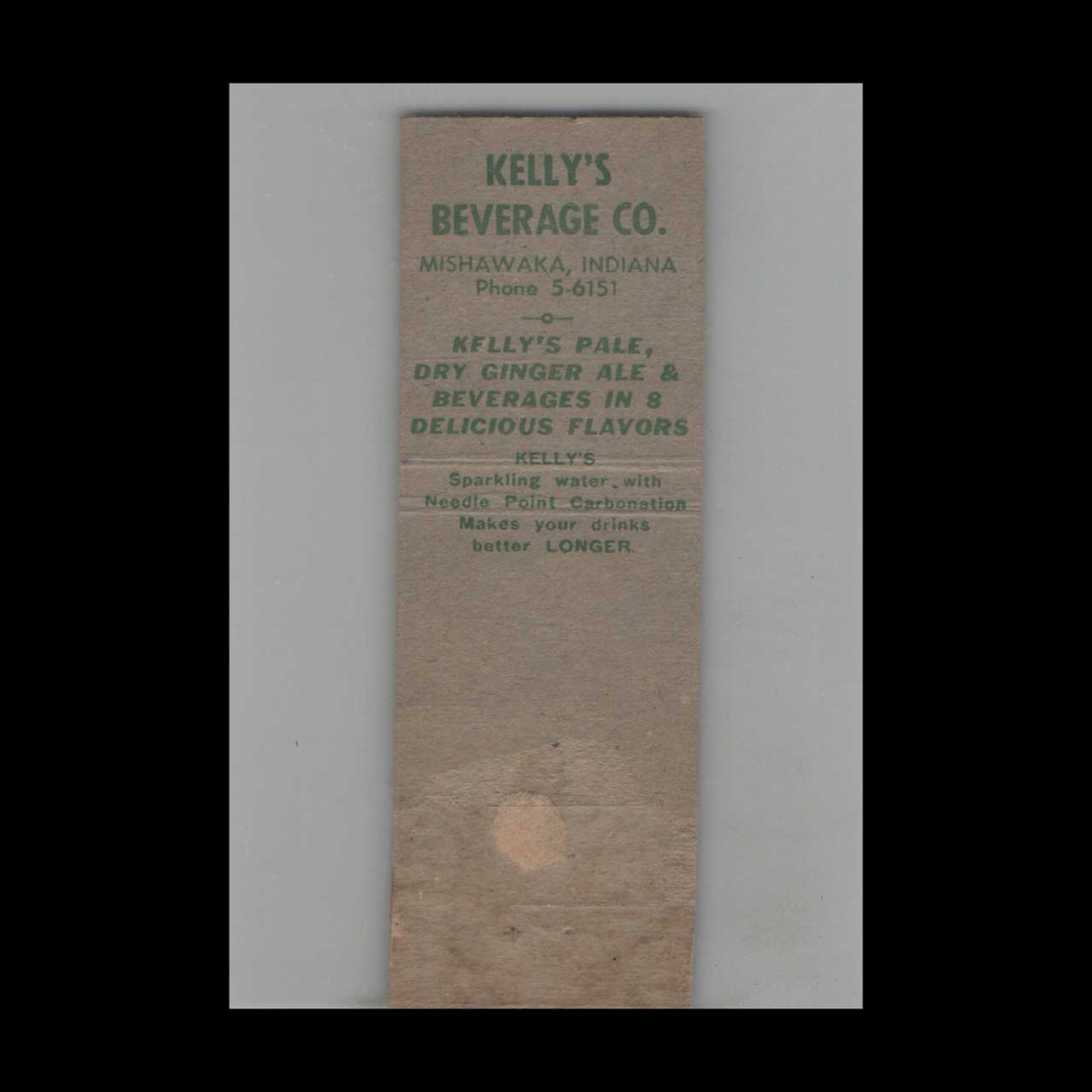 Kelly’s Beverages in Mishawaka, IN, offered refreshing Pale Dry Ginger Ale with a local charm. This vintage matchbook is a nostalgic piece of Americana for collectors.