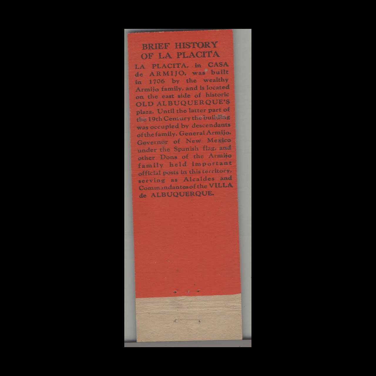Discover LaPlacita in Casa De Armijo, a historic Albuquerque landmark blending Southwestern charm and heritage. A nostalgic piece of Americana for vintage matchbook collectors.