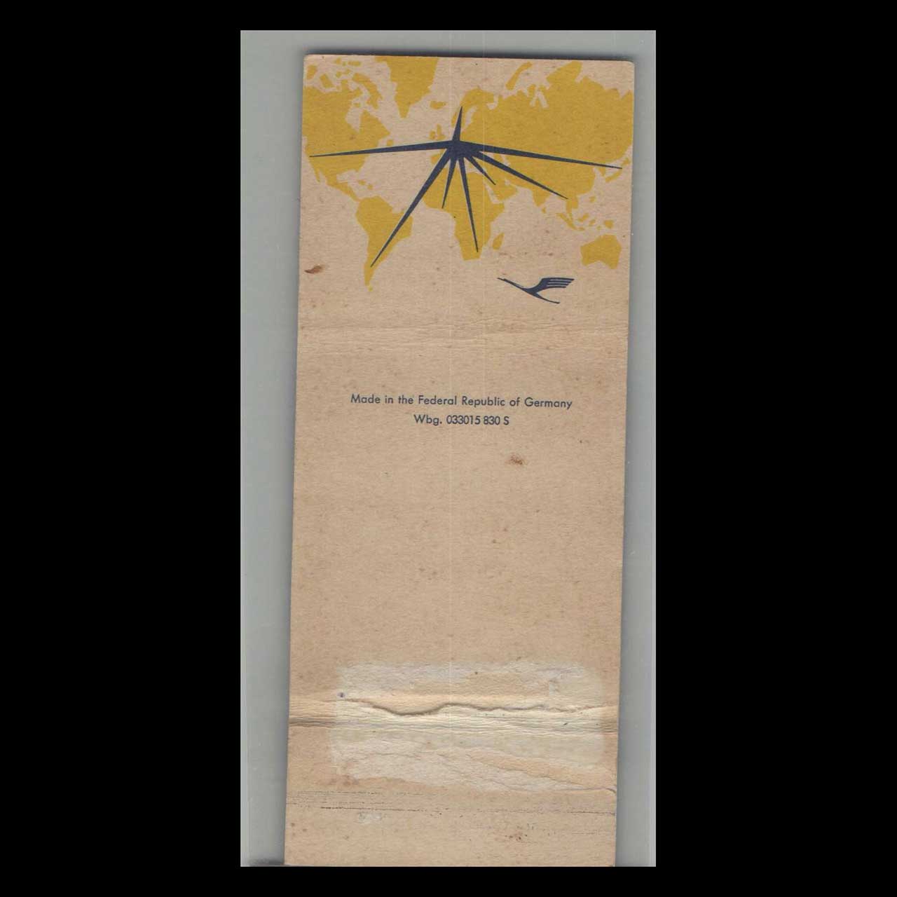 Lufthansa Airlines vintage matchbook featuring iconic Boeing aircraft, symbolizing mid-century aviation excellence. A nostalgic piece of Americana for collectors and aviation enthusiasts alike.