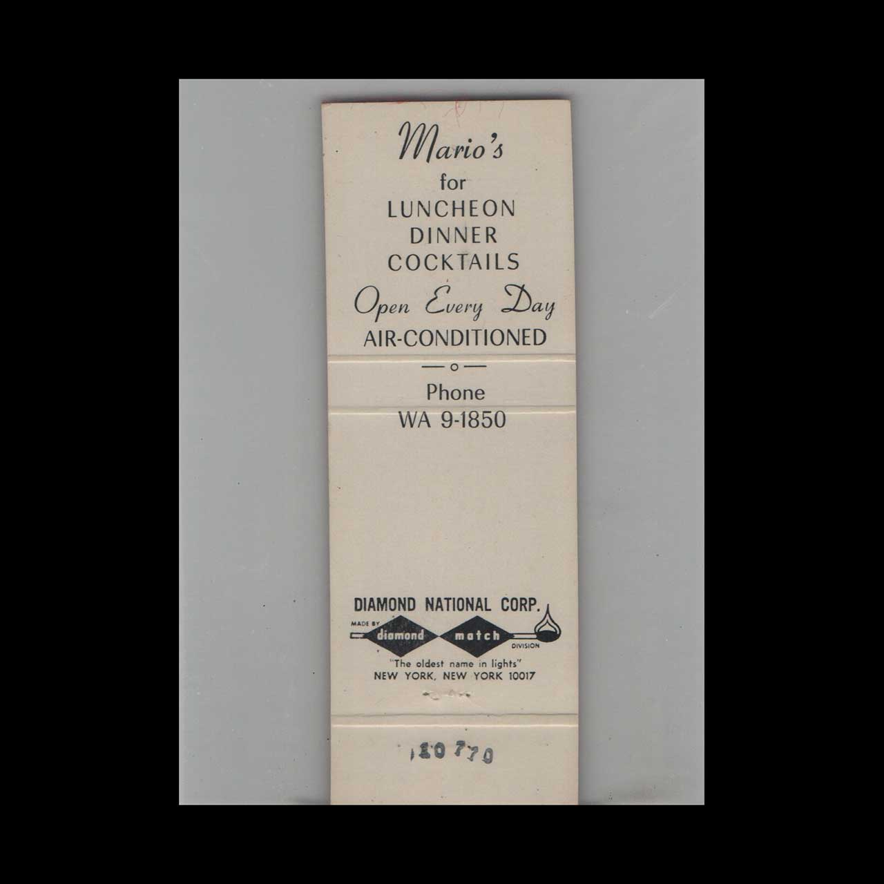 Discover Mario’s, a beloved Greenwich Village eatery known for its authentic Italian charm and vibrant NYC atmosphere. This vintage matchbook is a classic ephemera relic cherished by Americana collectors.