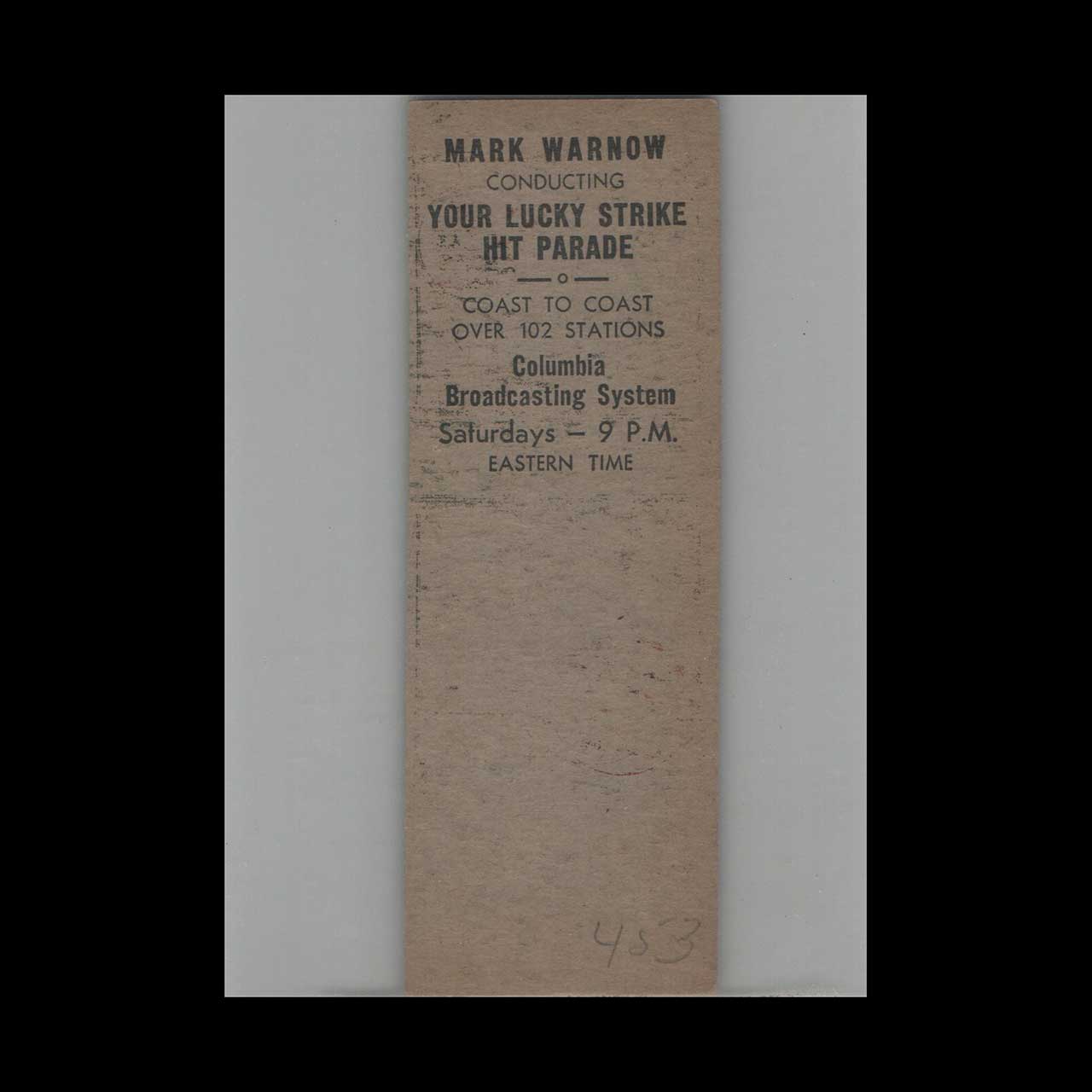 Discover the Mark Warnow Lucky Strike Hit Parade sales sample from New York, a promotional gem from a legendary music broadcast. A nostalgic piece of Americana for collectors and vintage ephemera enthusiasts.