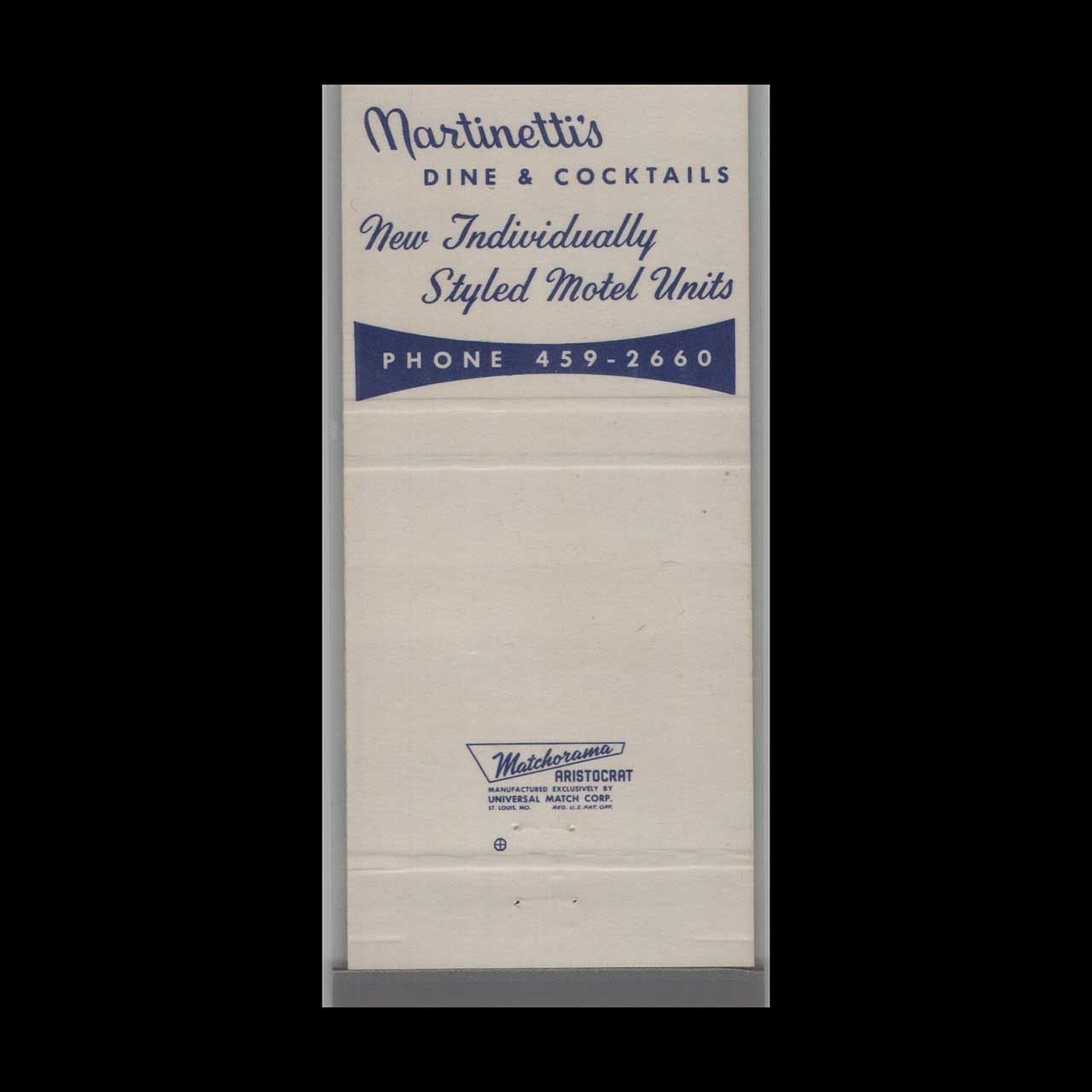 <h3>About this Vintage Matchbook</h3> <p>Martinetti’s Motel Dine & Cocktails in Crystal Lake, IL, offered classic mid-century hospitality and dining. A nostalgic piece of Americana for vintage matchbook collectors.</p> <p><strong>Brand:</strong> Matchbook Cover – Martinetti’s Motel Dine & Cocktails Crystal Lake, IL</p> <p><strong>Category:</strong> Vintage Americana Memorabilia</p>