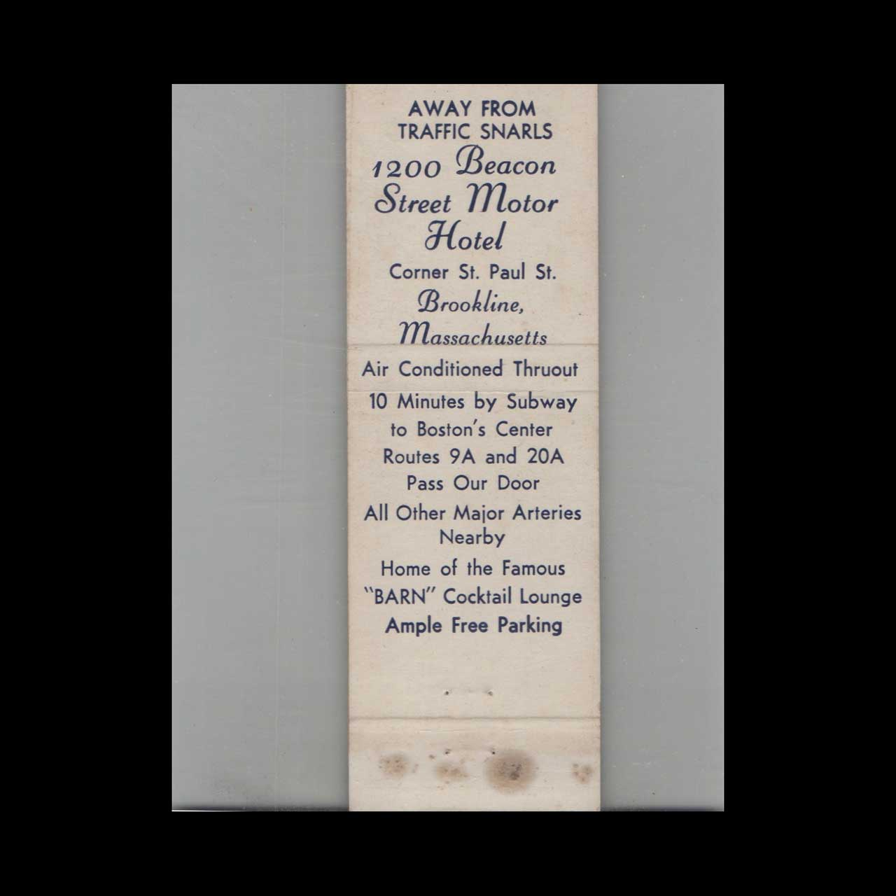Vintage matchbook cover advertising 1200 Beacon Street Motor Hotel Brookline, MA.