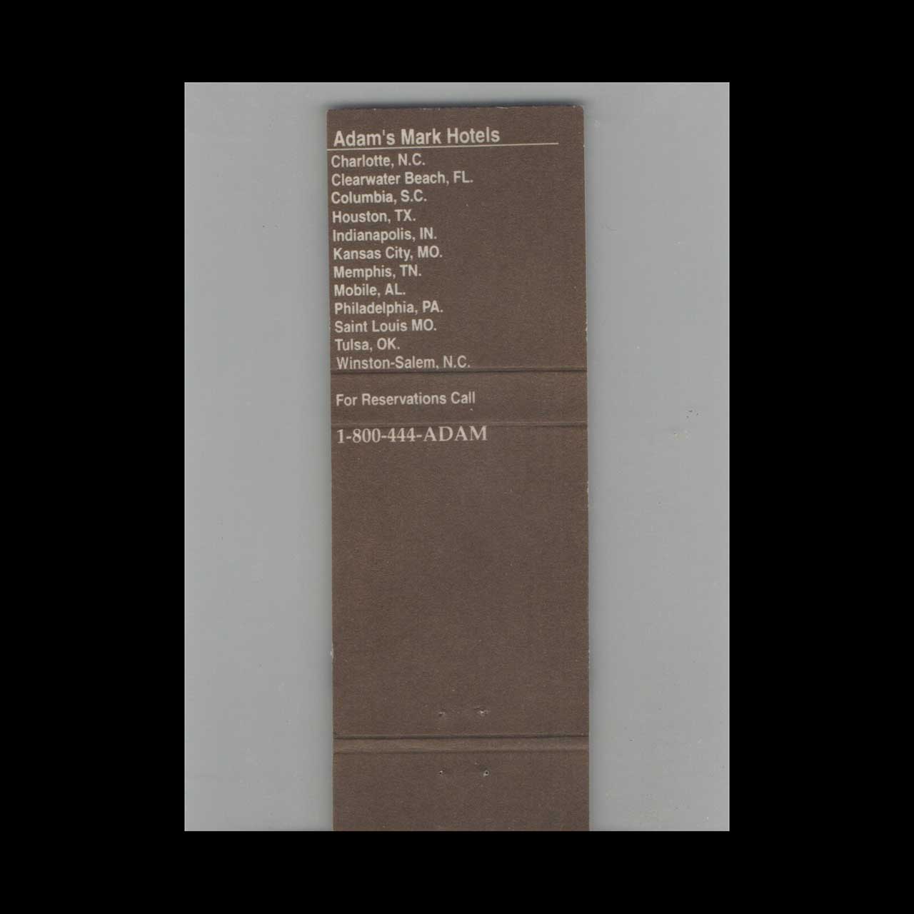This vintage matchbook cover promotes Adams Mark Hotels Various Locations #8. Produced during the mid-century advertising era, it reflects period typography and graphic design. A collectible piece of American advertising ephemera suitable for display or archival preservation.