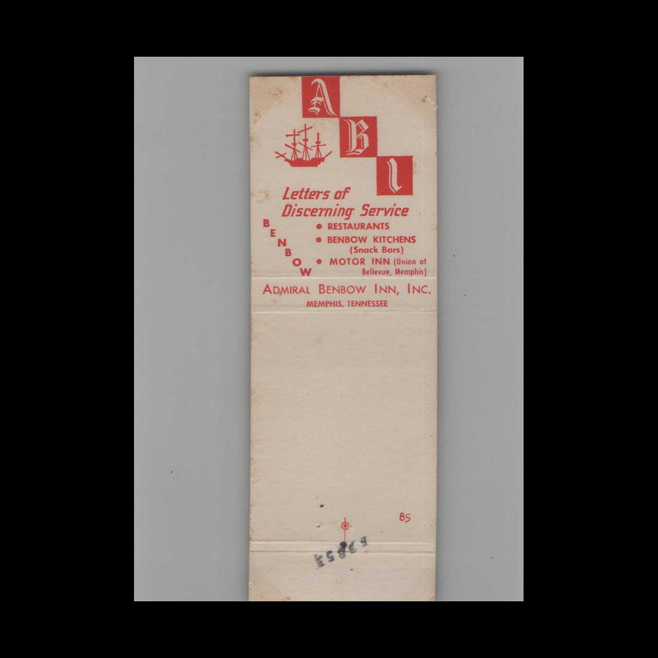 Vintage matchbook cover advertising Admiral Benbow Hotel Memphis TN #1.