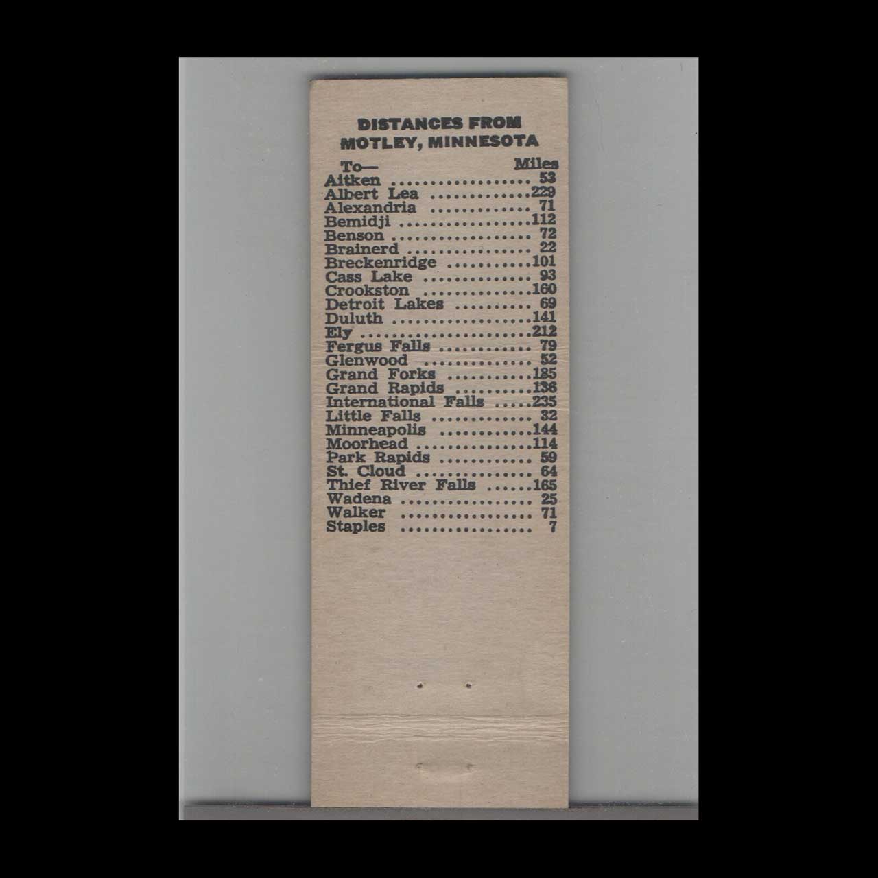 Vintage matchbook cover advertising Al’s Bar Motley, MN.