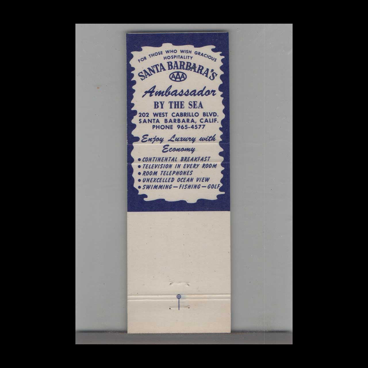 Vintage matchbook cover advertising Ambassador By The Sea Motel Santa Barbara, CA.