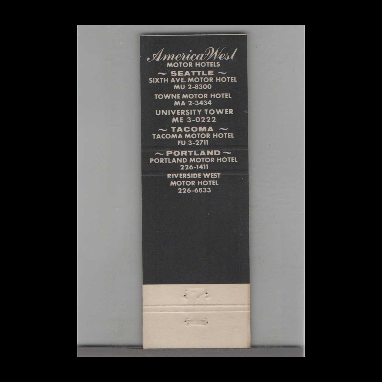 This vintage matchbook cover promotes America West Accommodations. Produced during the mid-century advertising era, it reflects period typography and graphic design. A collectible piece of American advertising ephemera suitable for display or archival preservation.