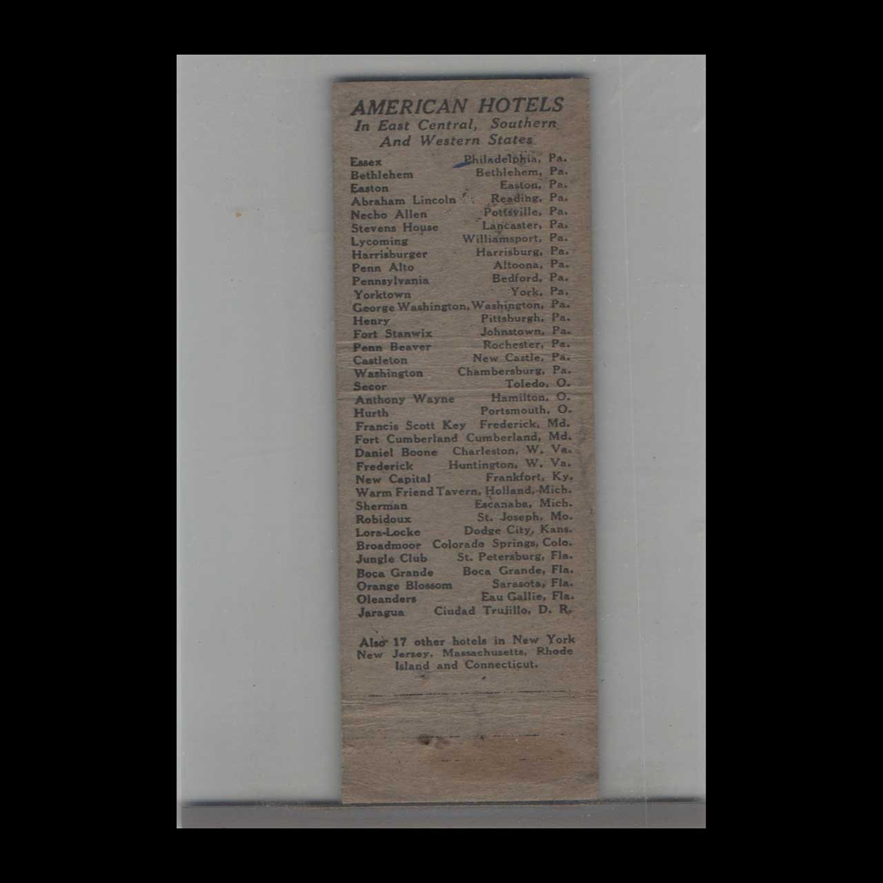 Vintage matchbook cover advertising American Hotels Corporation Holland, MI.