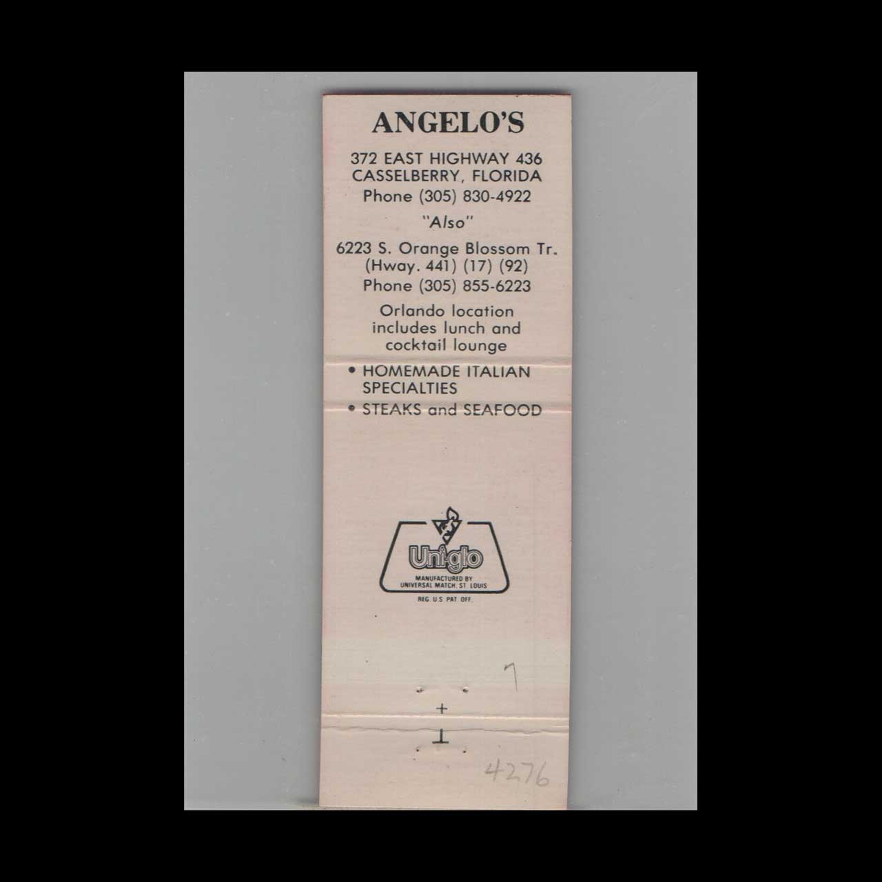 Vintage matchbook cover advertising Angelo’s Italian Cuisine Orlando, FL #2.