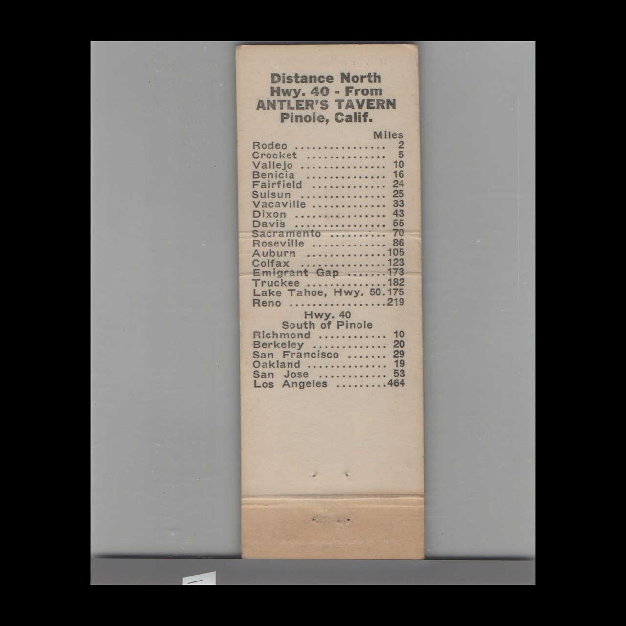 Vintage matchbook cover advertising Antler’s Tavern Pinole, CA.