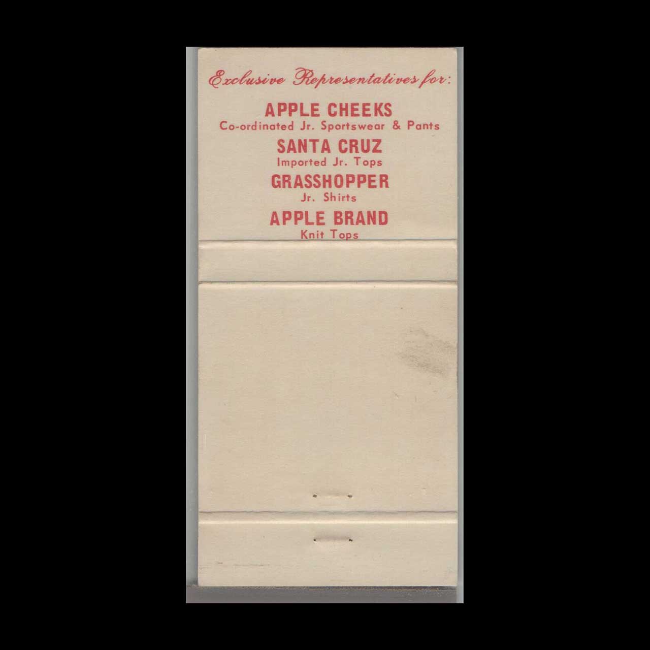 Vintage matchbook cover advertising Apple Cheeks Apple Industries New York, NY.