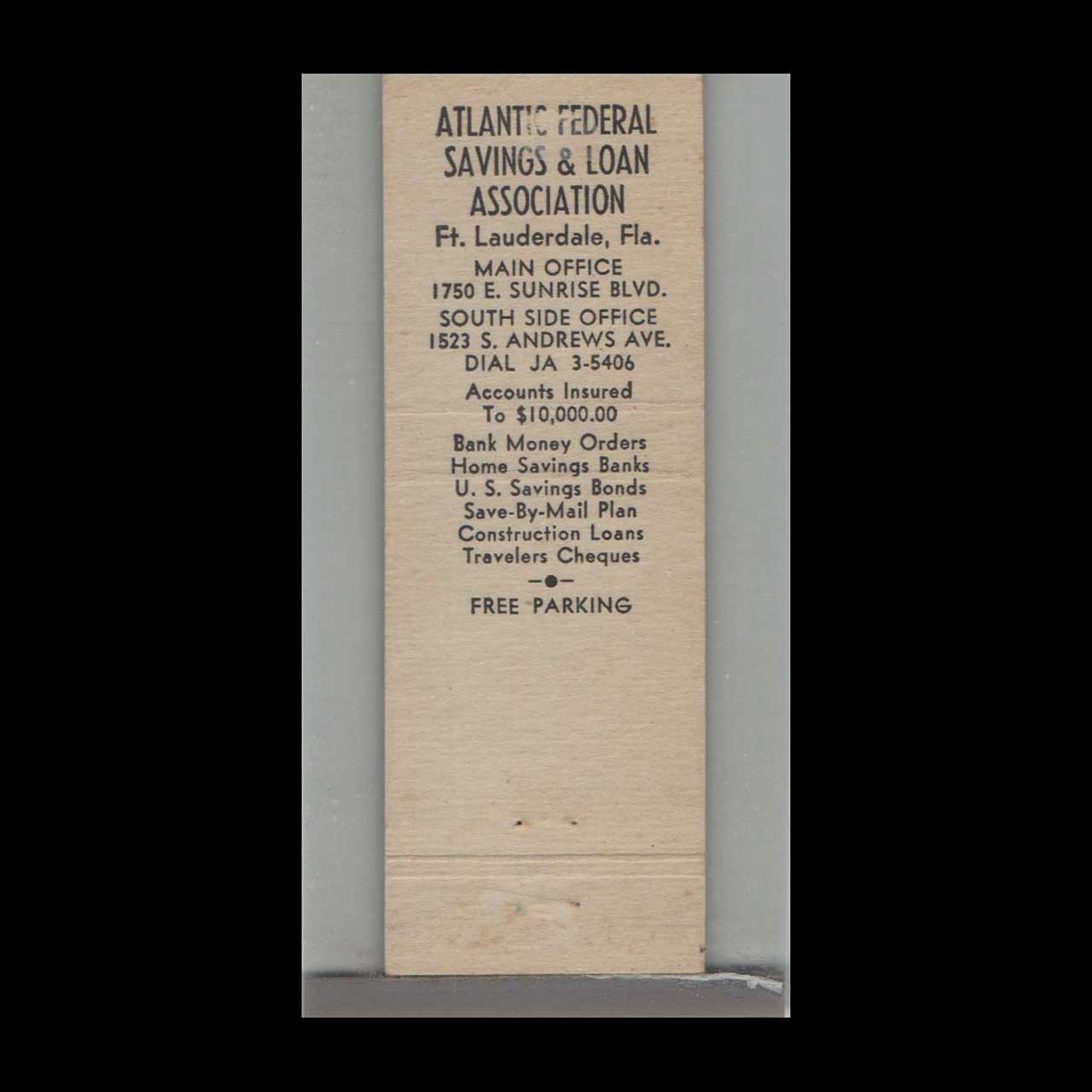 Vintage matchbook cover advertising Atlantic Federal Savings Bank Ft. Lauderdale FL.