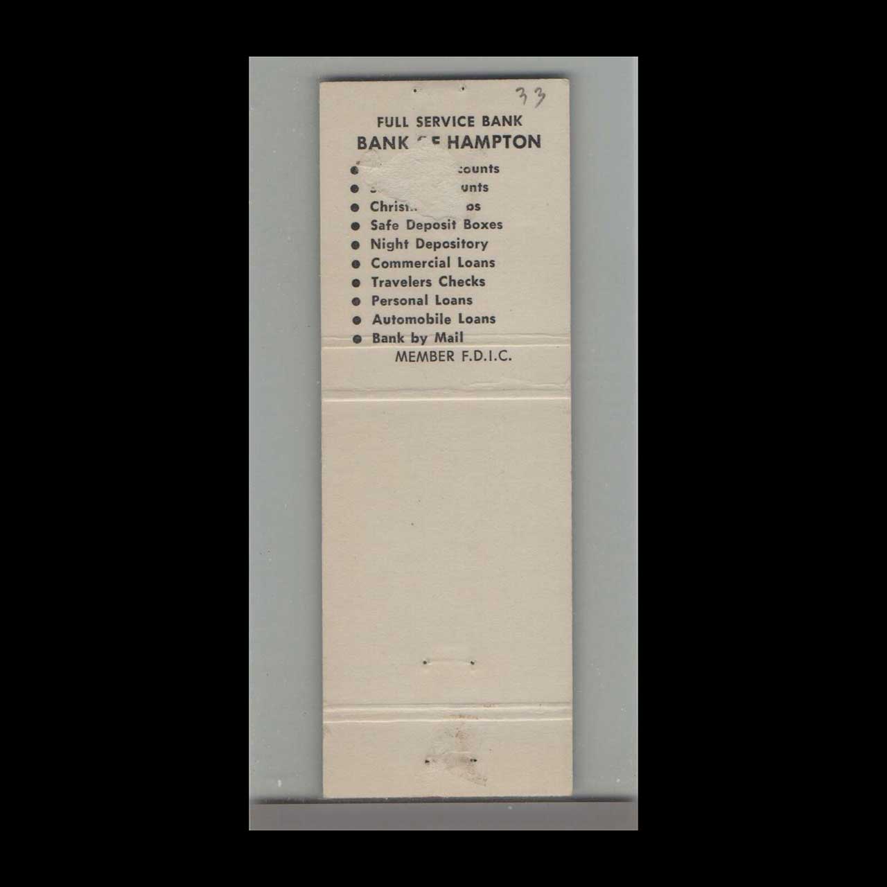 Vintage matchbook cover advertising Bank of Hampton, GA.