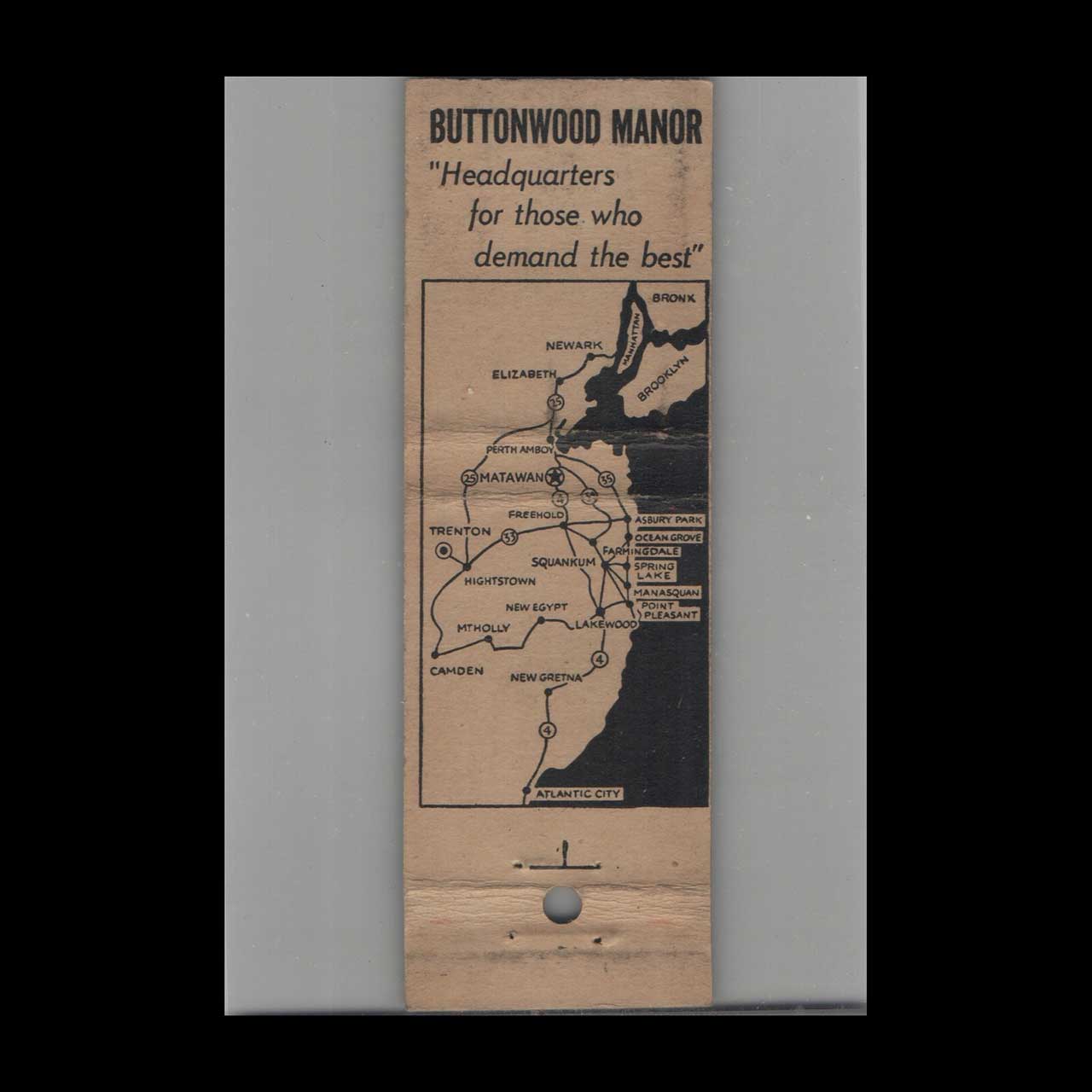 Vintage matchbook cover advertising Buttonwood Manor Matawan, NJ.