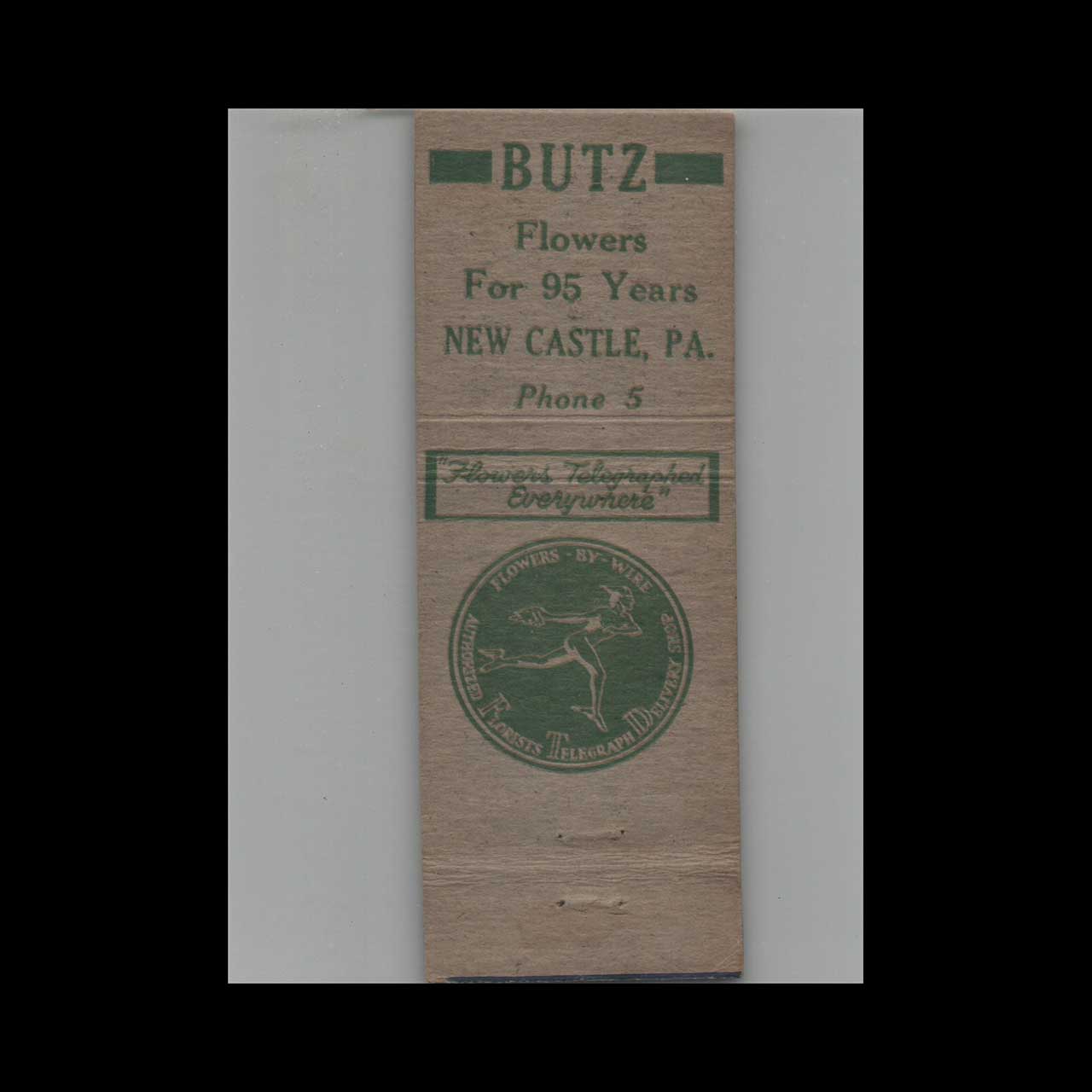 Vintage matchbook cover advertising Butz Florists New Castle PA.