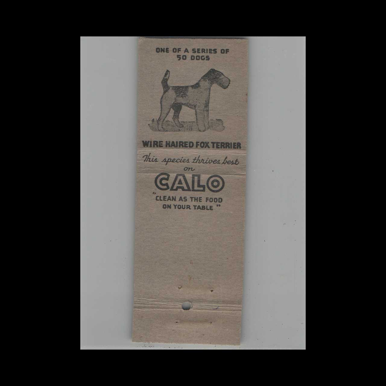 Vintage matchbook cover advertising Calo Dog Food for All Dogs and Cats.