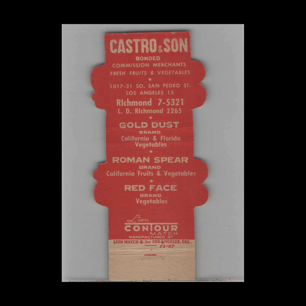 Vintage matchbook cover advertising Castro & Son Fresh Fruits & Vegetables Los Angeles, CA.