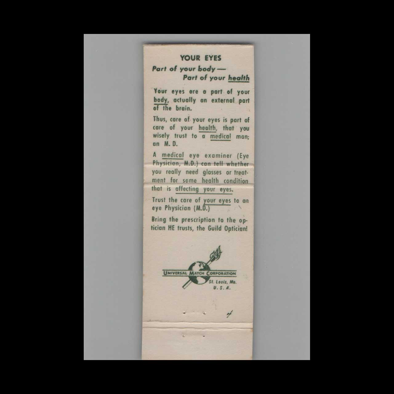 Vintage matchbook cover advertising Corley’s Opticians Macon GA.