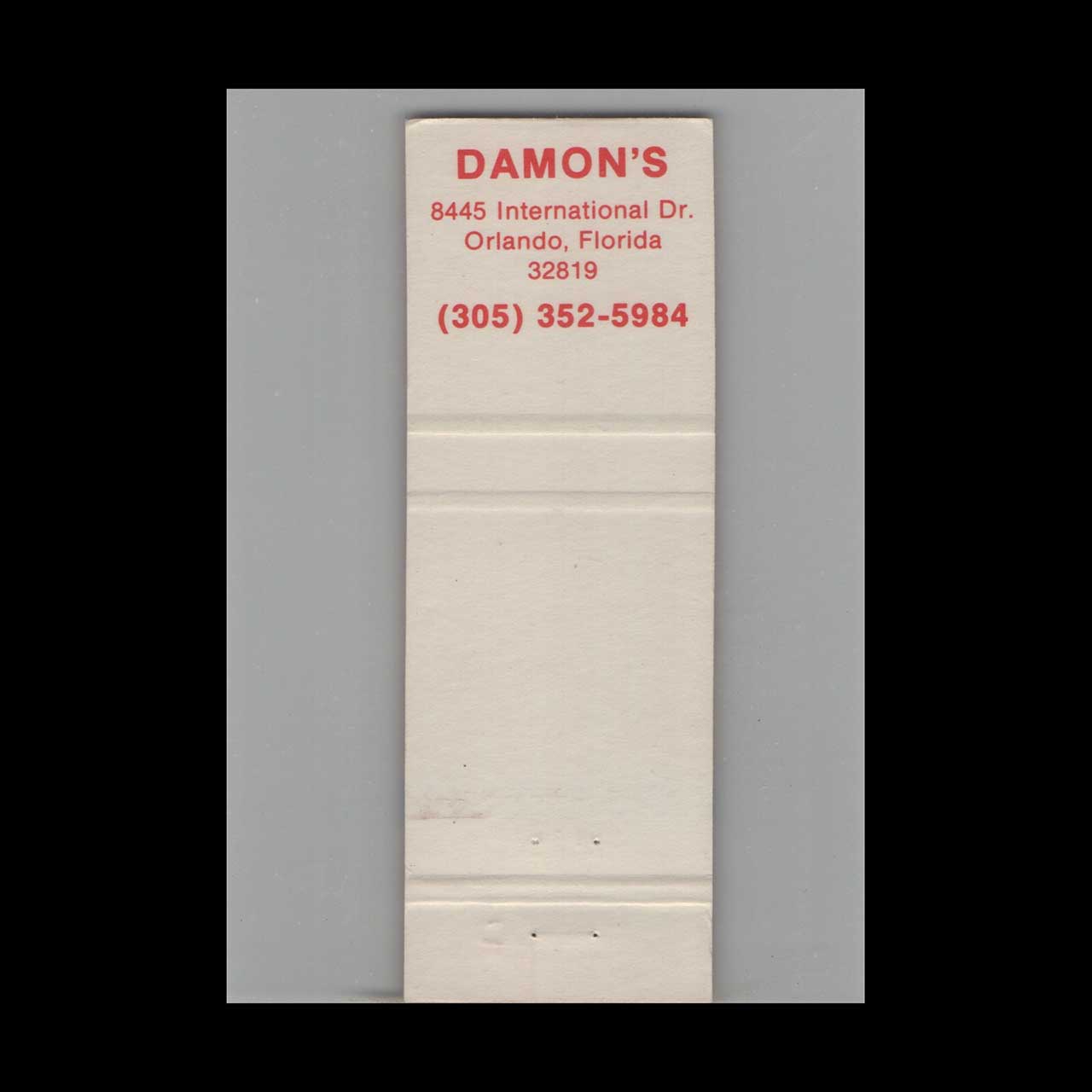 Vintage matchbook cover advertising Damon’s The Place For Ribs Orlando, FL.
