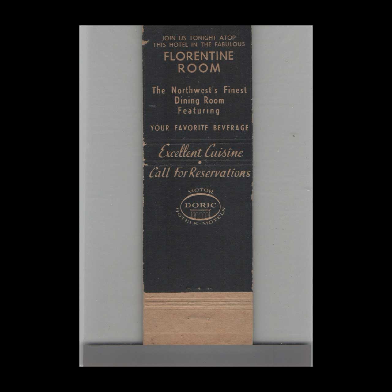 Vintage matchbook cover advertising Doric Bellingham Hotel San Juan Room Bellingham, WA.
