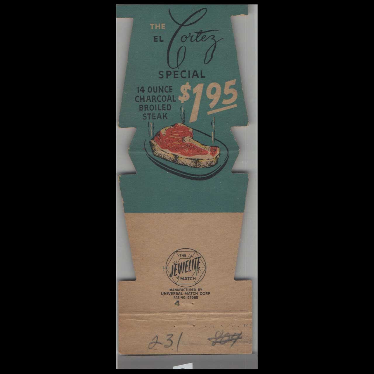 This vintage matchbook cover promotes El Cortez Hotel Las Vegas, NV. Produced during the mid-century advertising era, it reflects period typography and graphic design. A collectible piece of American advertising ephemera suitable for display or archival preservation.