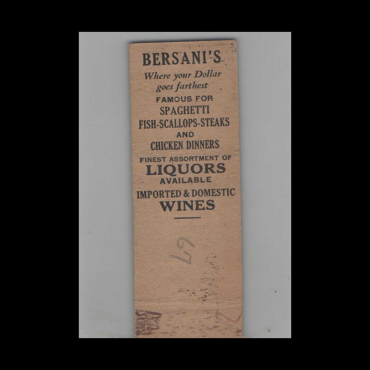 Matchbook Cover Federal Match Co. Bersani’s Family Restaurant Syracuse NY