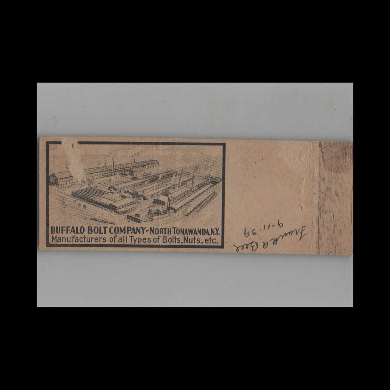 Matchbook Cover Federal Match Co. Buffalo Bolt Company Buffalo NY