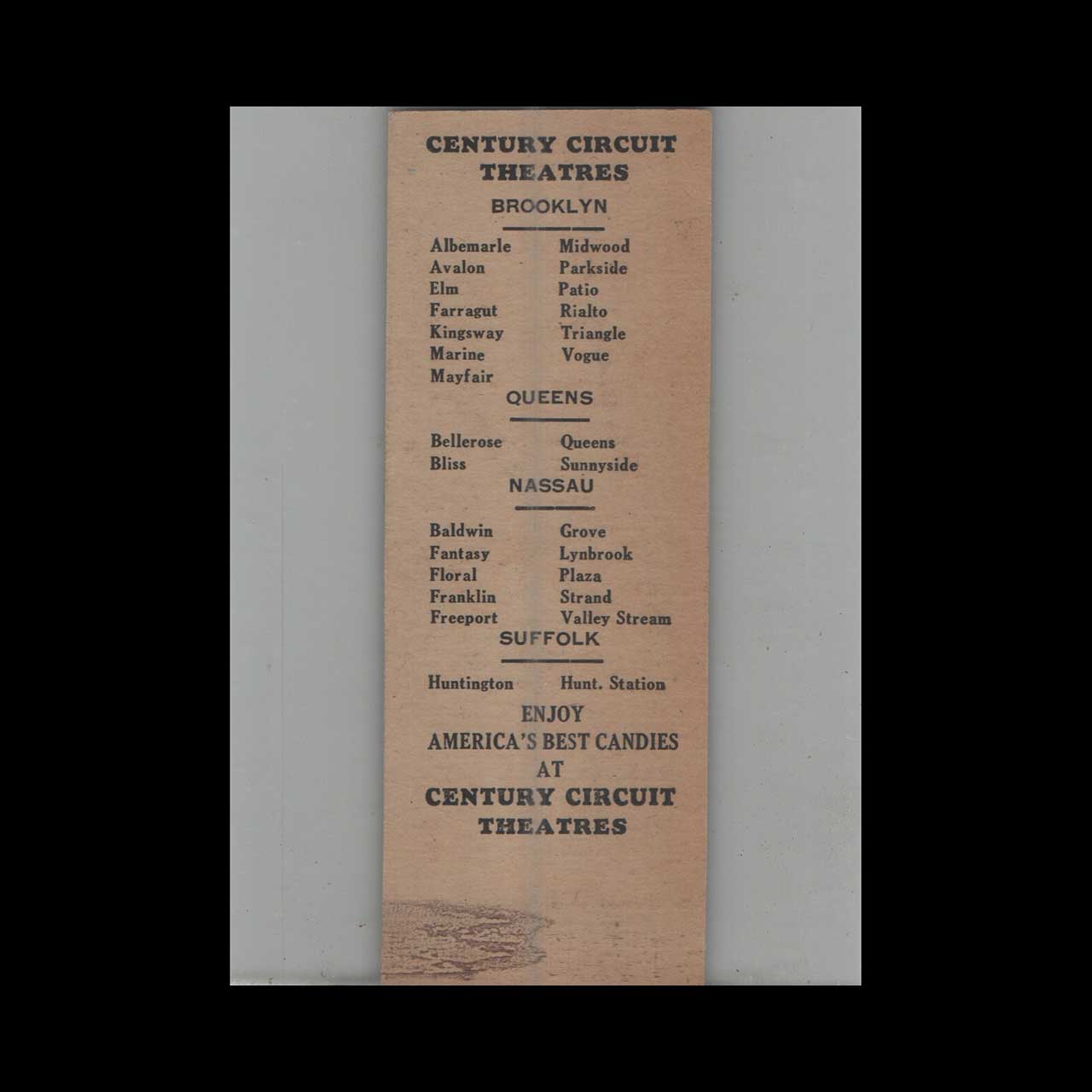 Matchbook Cover Federal Match Co. Century Circuit Theatres NY