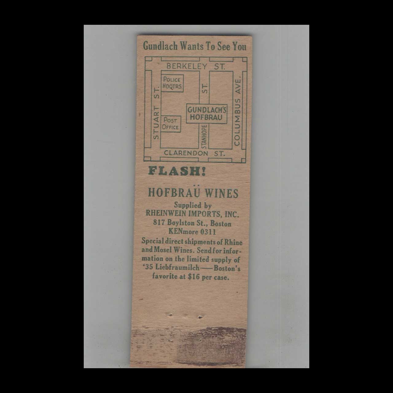 Matchbook Cover Federal Match Co. Gundlach’s Hofbrau Boston MA