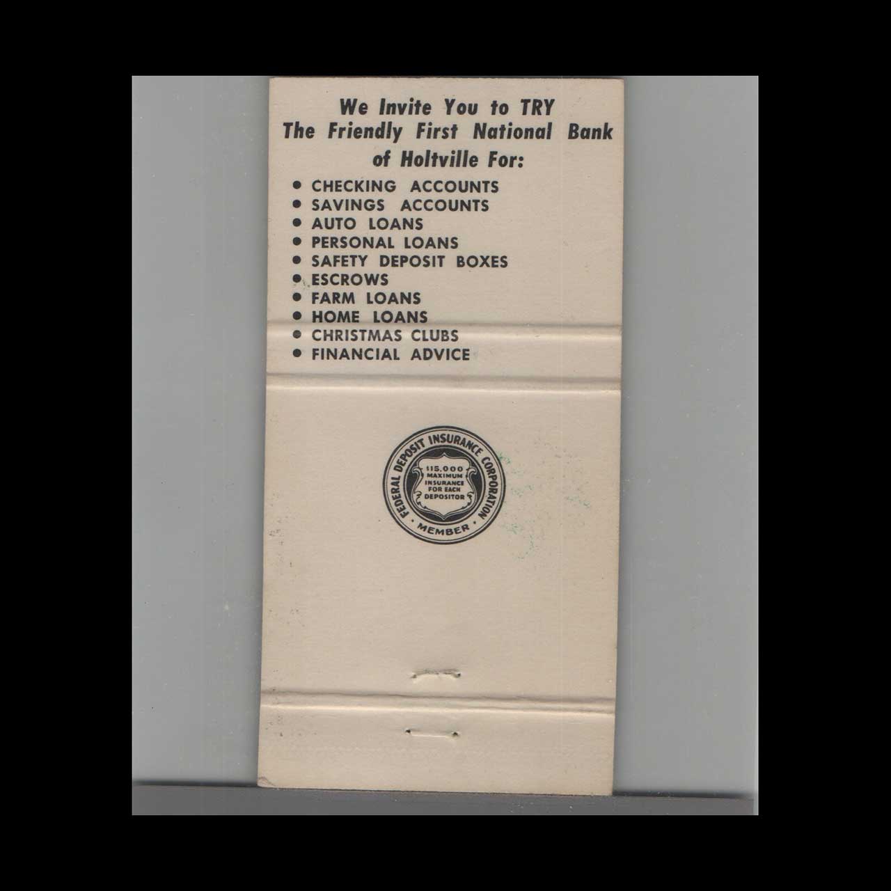 Vintage matchbook cover advertising First National Bank of Holtville, CA.