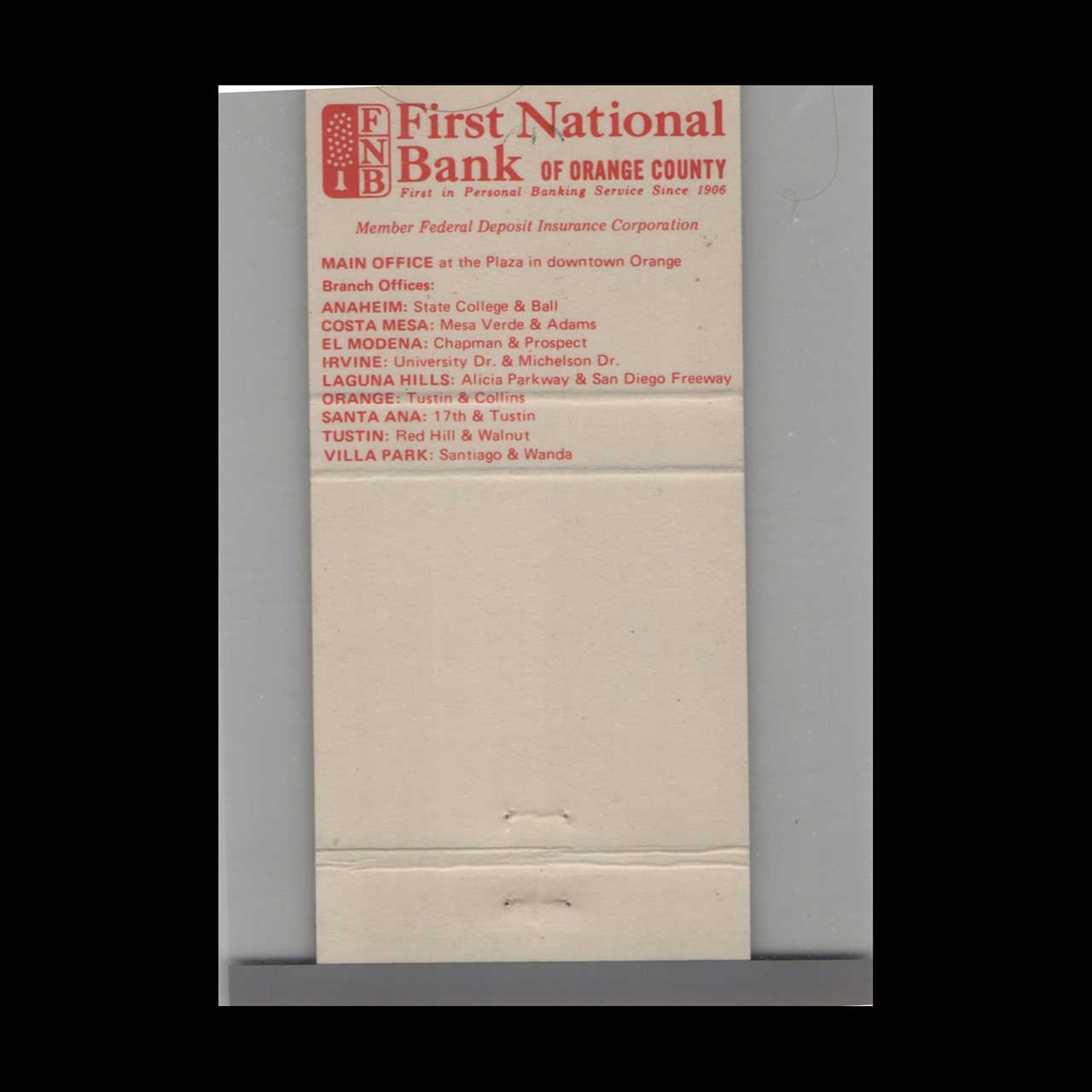 Vintage matchbook cover advertising First National Bank Of Orange County California.